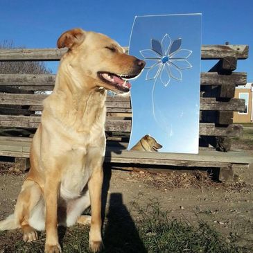 One of a kind glass mirror flowers. Whats your favorite flower? Beauty dog is in love with this one!